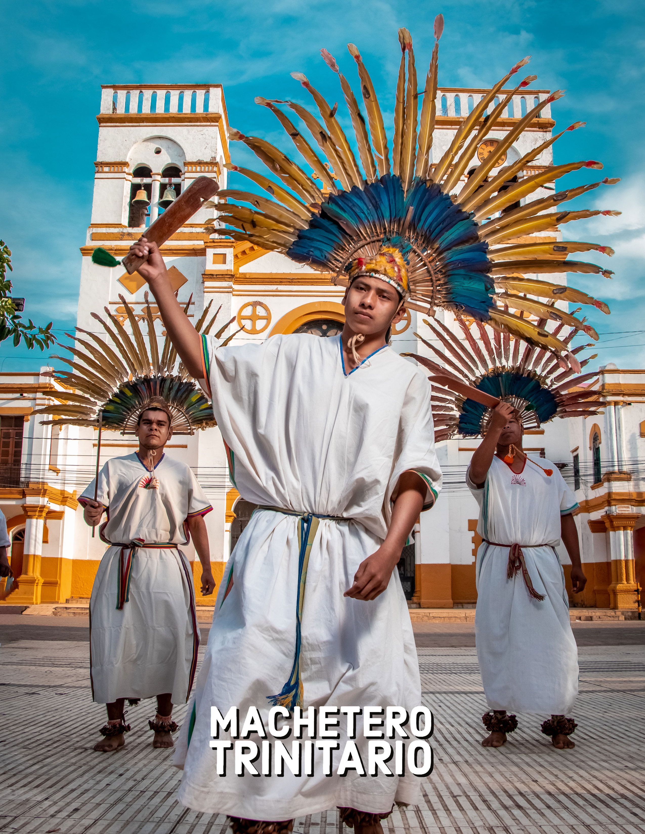 EL MACHETERO TRINITARIO ES UNA DANZA ANCESTRAL QUE EXPRESA SIGNIFICADOS MOJEÑOS RELIGIOSOS. SU ELEMENTO MÁS REPRESENTATIVO ES EL PLUMAJE, QUE SIMBOLIZARÍA LAS VELAS QUE ALUMBRAN LAS FIESTAS Y EL SOL QUE ILUMINA LAS FESTIVIDADES. EL MACHETERO ACOMPAÑA AL CUERPO DEL CABILDO INDIGENAL, SIENDO ASÍ UN PERSONAJE POSEEDOR DE OBLIGACIONES SAGRADAS.